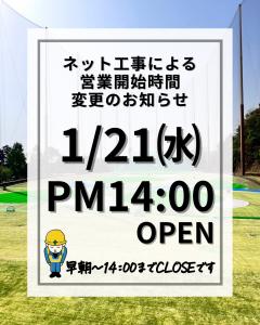 いつもグリーンヒルゴルフパークをご利用頂きありがとうございます。 強風による防球ネットトラブルの為、 1月21日水曜日、早朝より14時まで修理を行いますので、 午後14時からの営業とさせていただきます。 お客様には大変ご迷惑をおかけしますがご理解のほどよろしくお願いいたします。 |