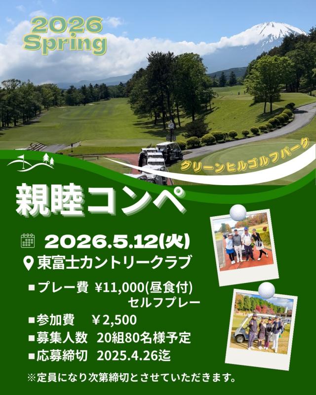 皆様、こんにちは(^_^) グリーンヒルゴルフパークの春のゴルフコンペを企画致しました✨ 5月12日(火曜日)に 東富士カントリークラブ様にて 開催致します🏌️🏌️ 当練習場のフロントに 詳細と申し込み用紙がございますので ご来場の際、ご覧くださいませ❗️ 沢山のご参加お待ちしています